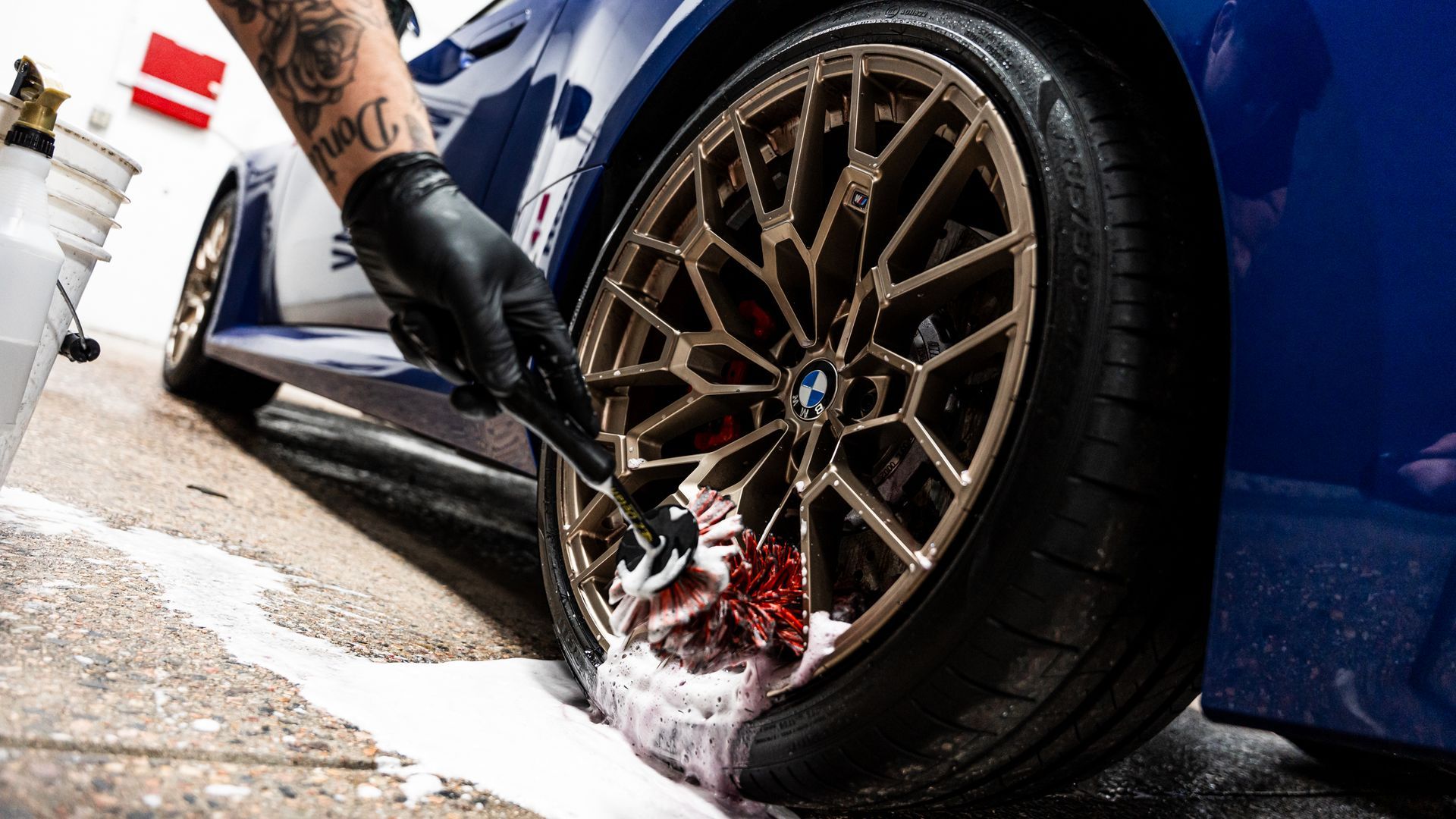 To begin our wash process, we typically start with the wheels since they are usually the dirtiest and it’s best to not spread that dirt and grime throughout the rest of the vehicle. For this, we use