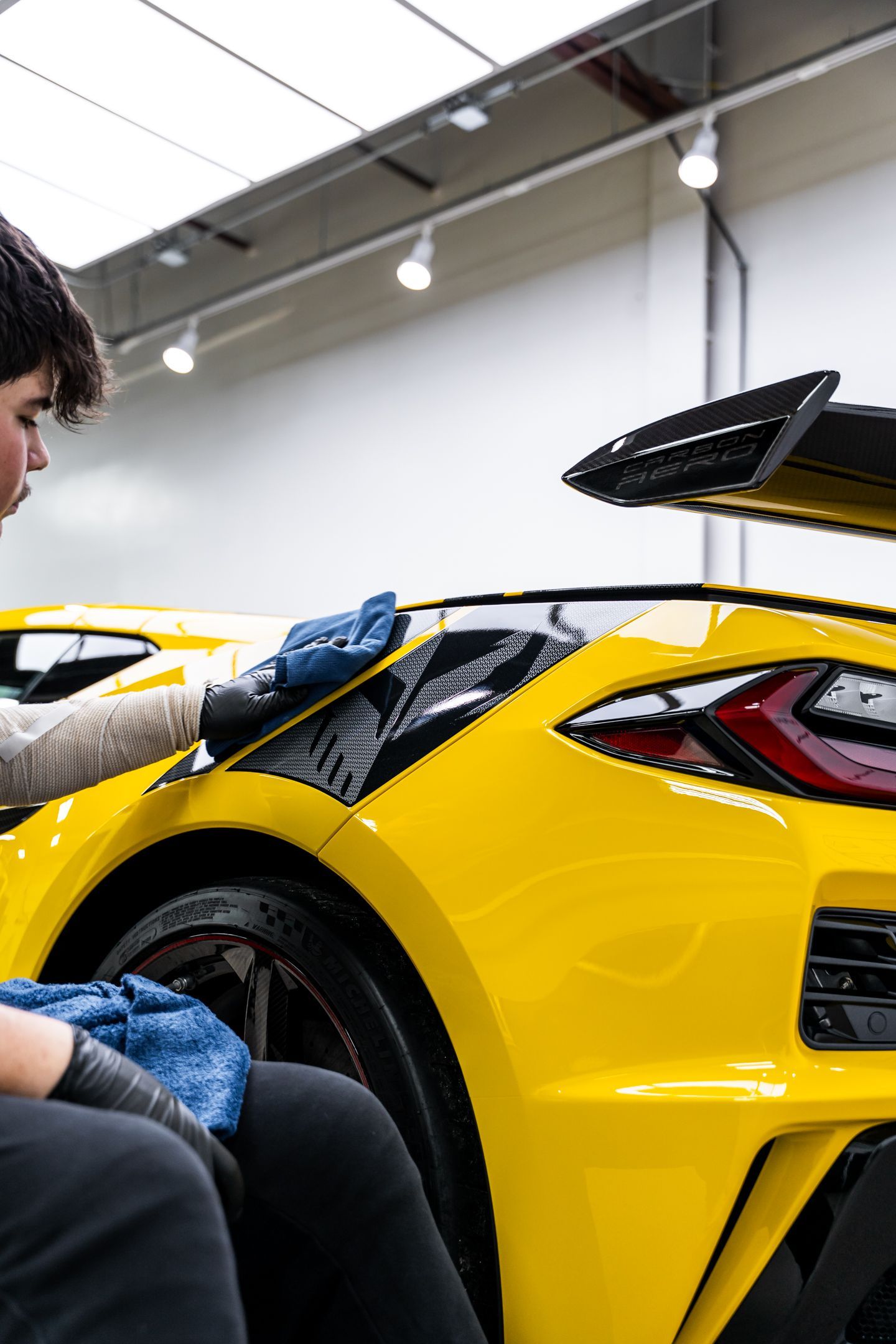 Once the entire car is protected with paint protection film, we’ll let the vehicle sit for at least 12 hours, allowing any moisture to dry and revealing any touch-ups we may need to do. Once every edge is wrapped and there are no further imperfections, this Z06 will land over in our light booth for its Ceramic Coating.
