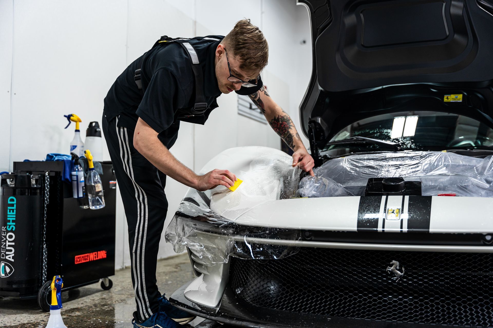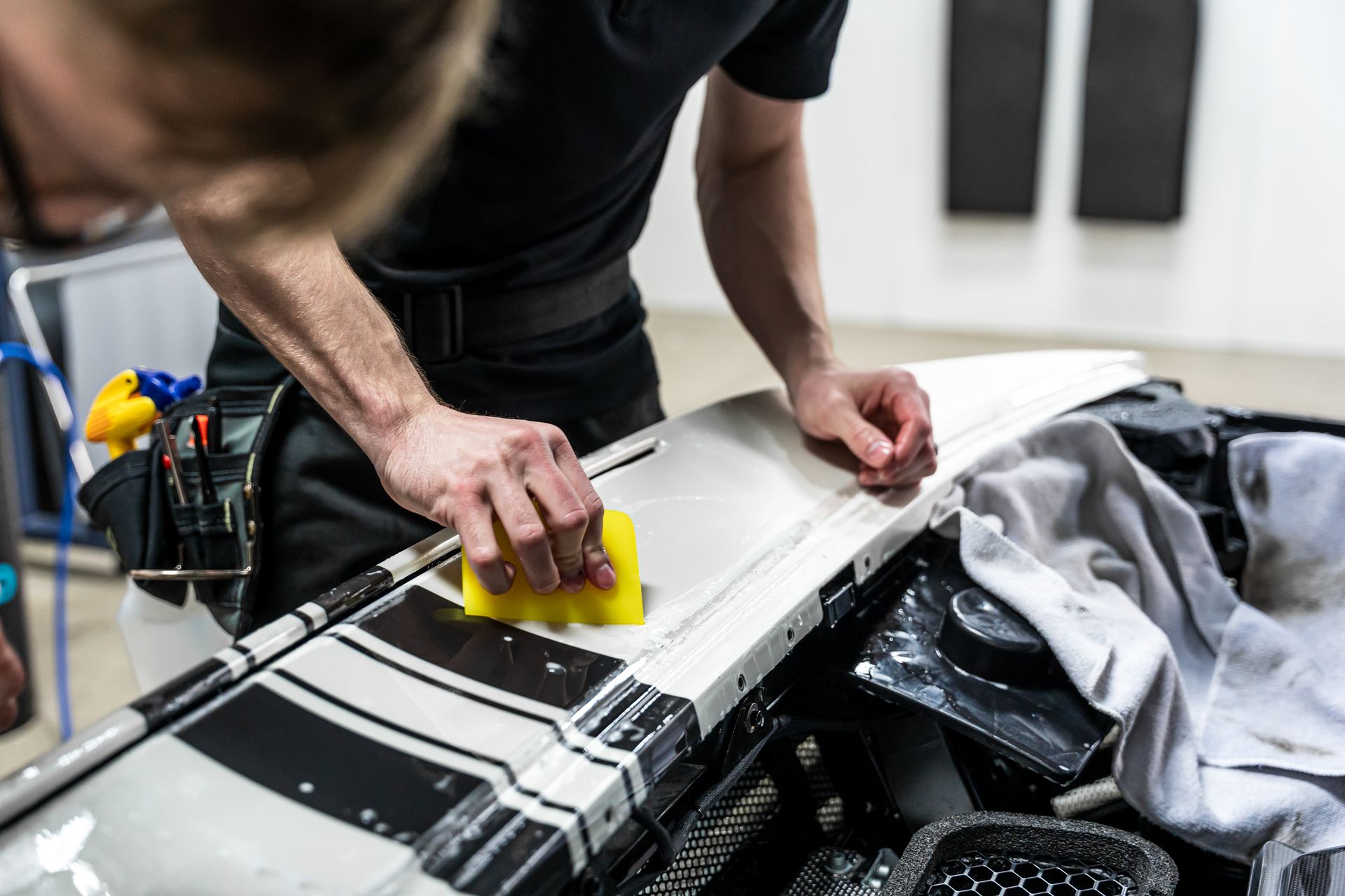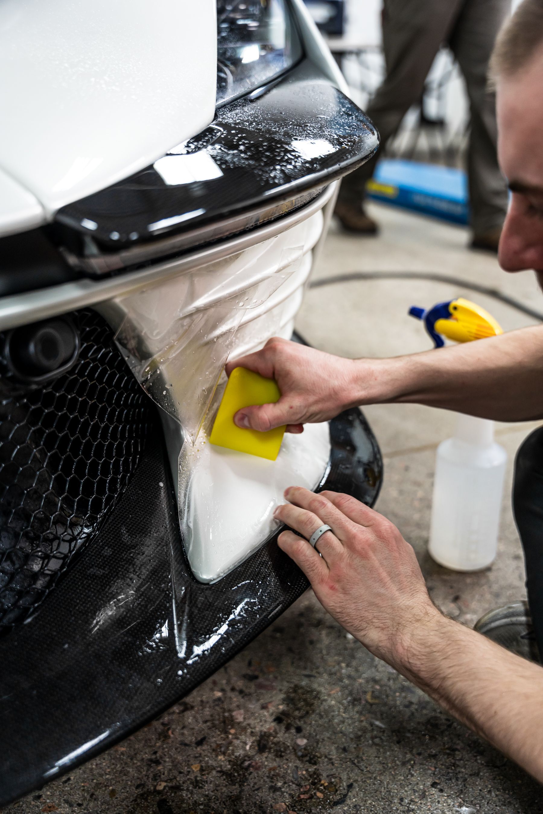 To get started with the clear bra installation, our installers will spray a slip solution onto the first panel. Using their hands, they will feel and inspect the panel, looking for any debris or dust that could interfere with the installation. Now that they're confident that nothing is on the panel, they will lay the film onto the panel. In order to secure the film and prevent it from moving, they’ll use a squeegee to set anchor points. Once everything is aligned, they’ll use the squeegee to push the slip solution out from underneath the film, allowing the PPF to adhere to the paint.