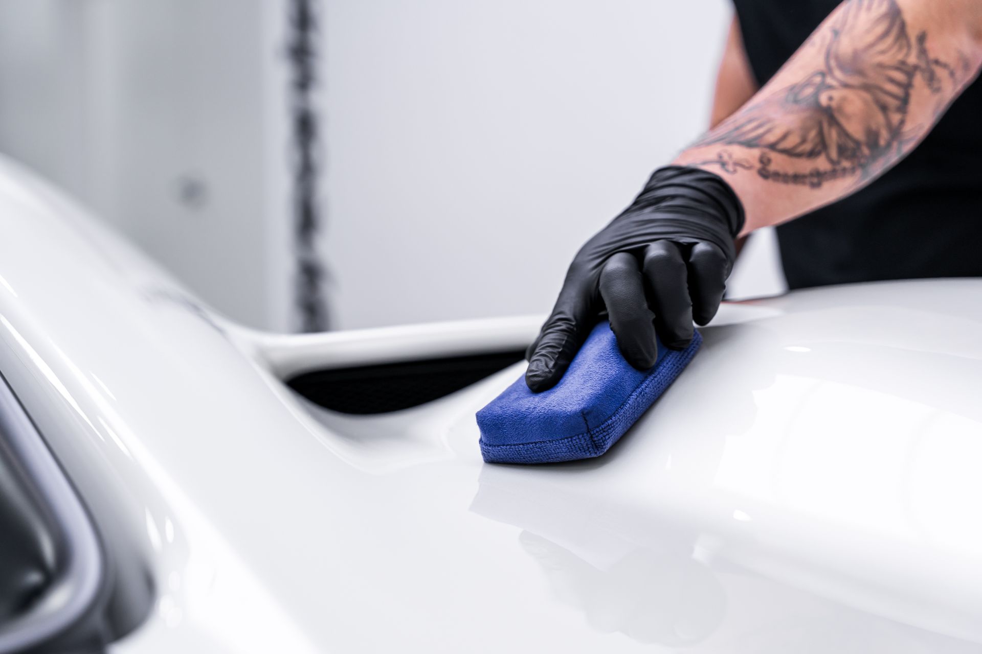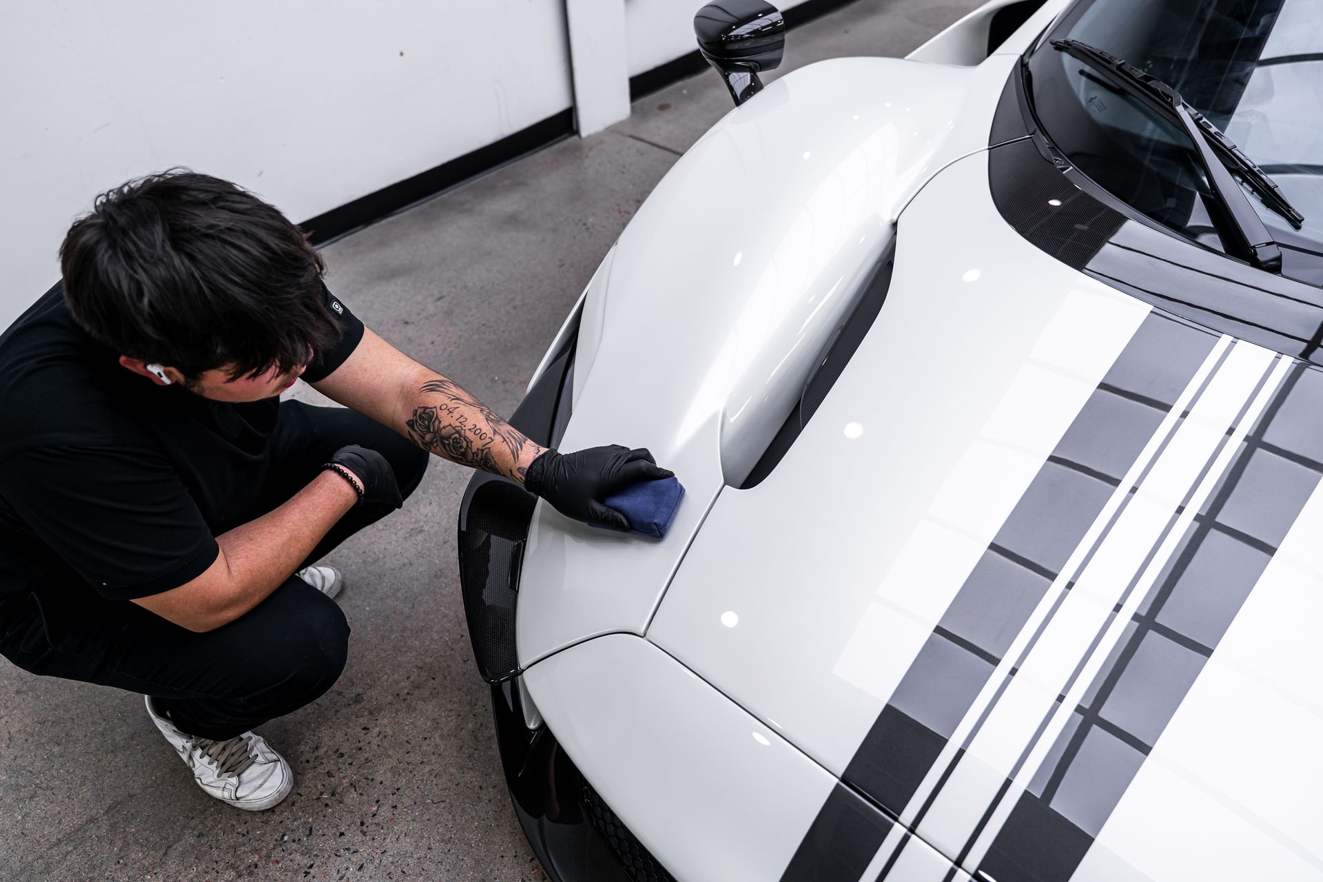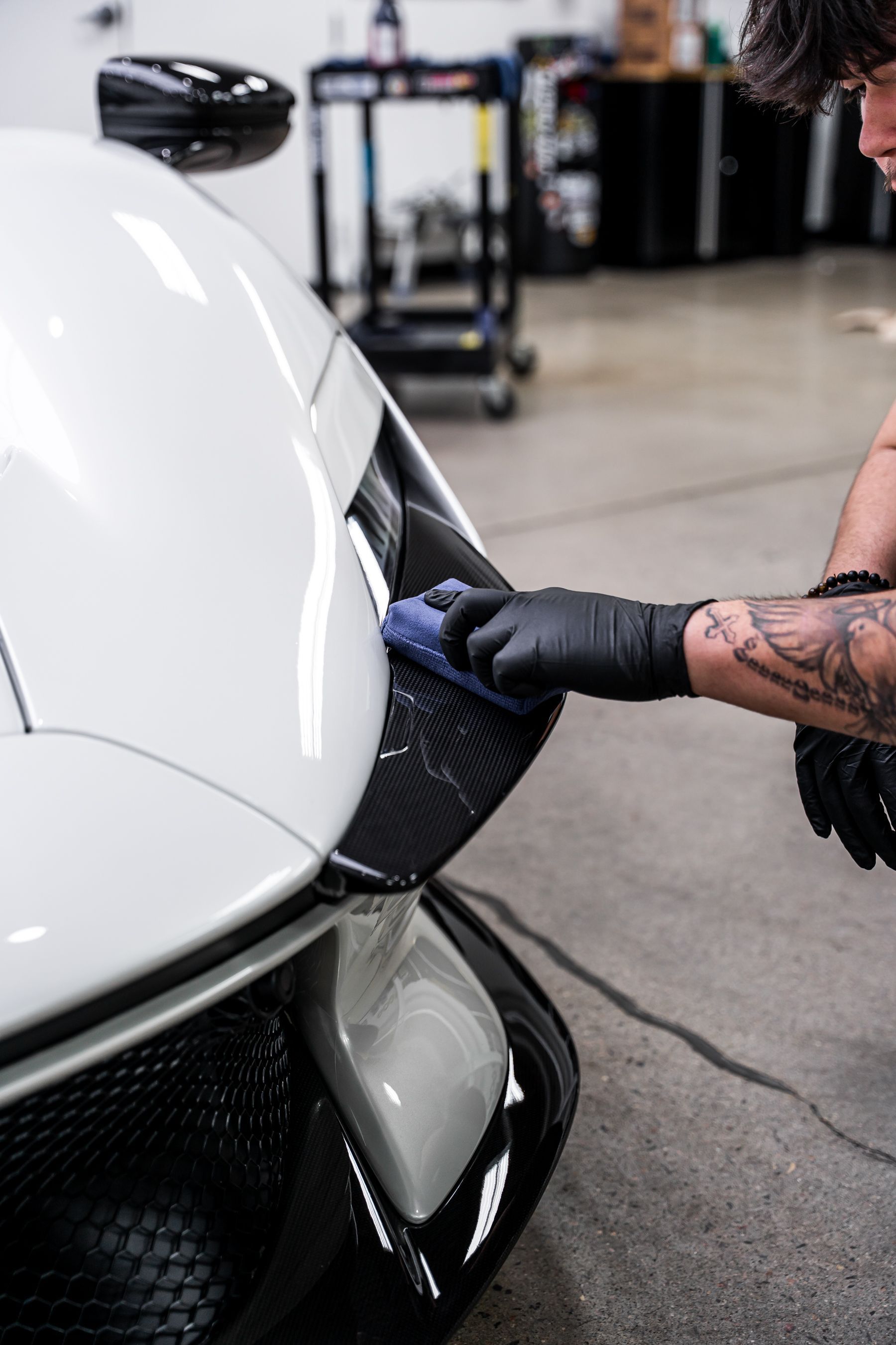 Once our detailers are finished preparing the car, they can begin to install the ceramic coating. We use specialized applicators to install ceramic coatings, so our detailers will first pour the coating onto the applicator and spread it onto the panel in a crosshatch pattern, being careful to not leave any paint un-coated. We always use two microfiber towels to remove any excess coating, making sure to not leave any high spots.