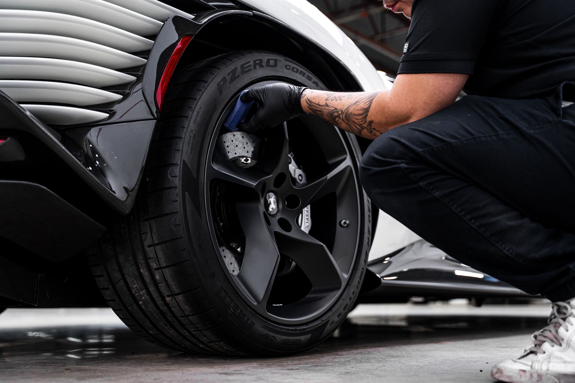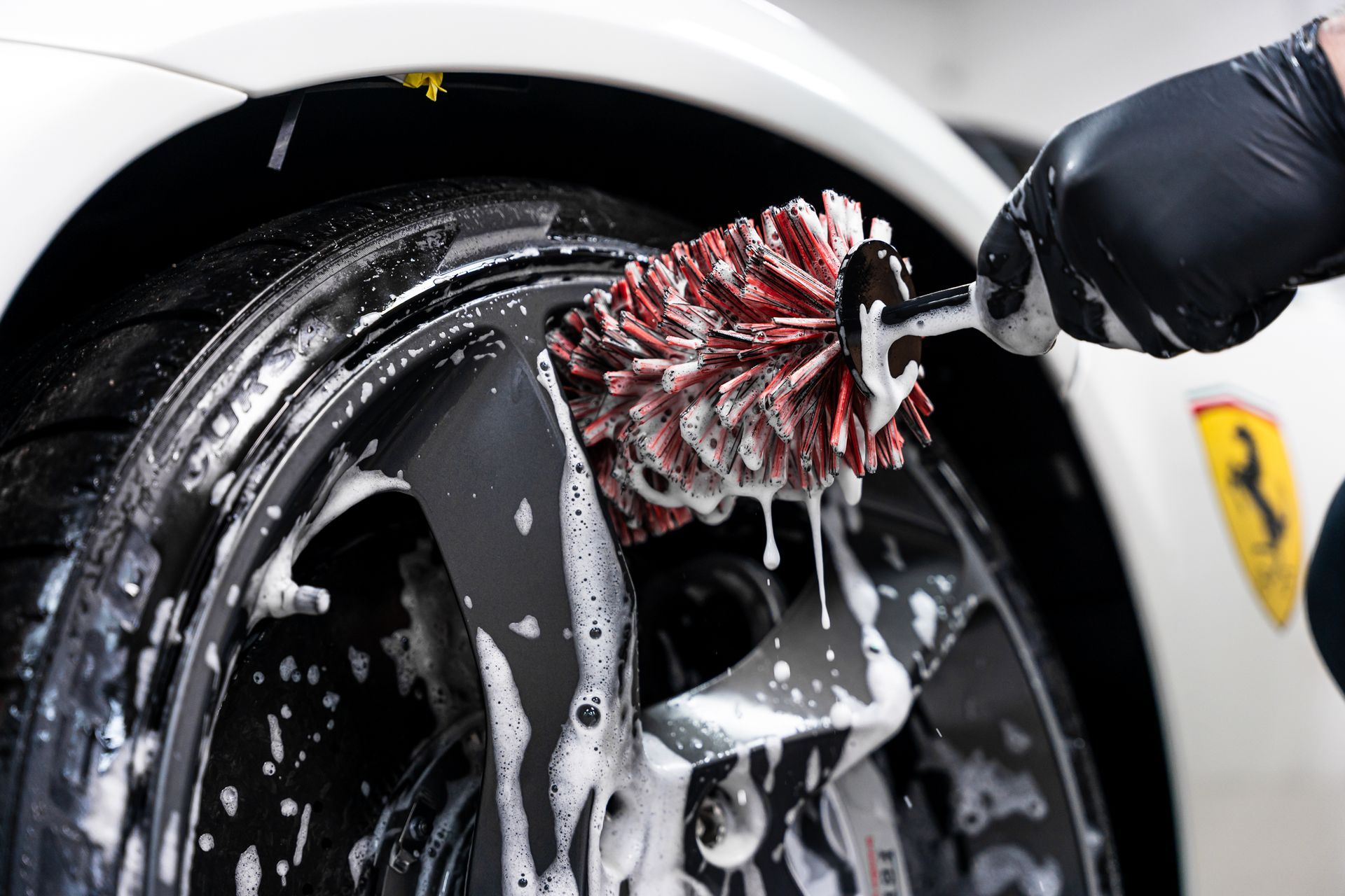 Before we touch the paint, however, we’ll get the wheels clean using a gentle yet effective wheel cleaner and a variety of specialized brushes. Unlike most vehicles that come through the studio, we won’t be using an Iron decontaminant on the wheels because of the carbon ceramic brakes equipped on this SP3 Daytona.