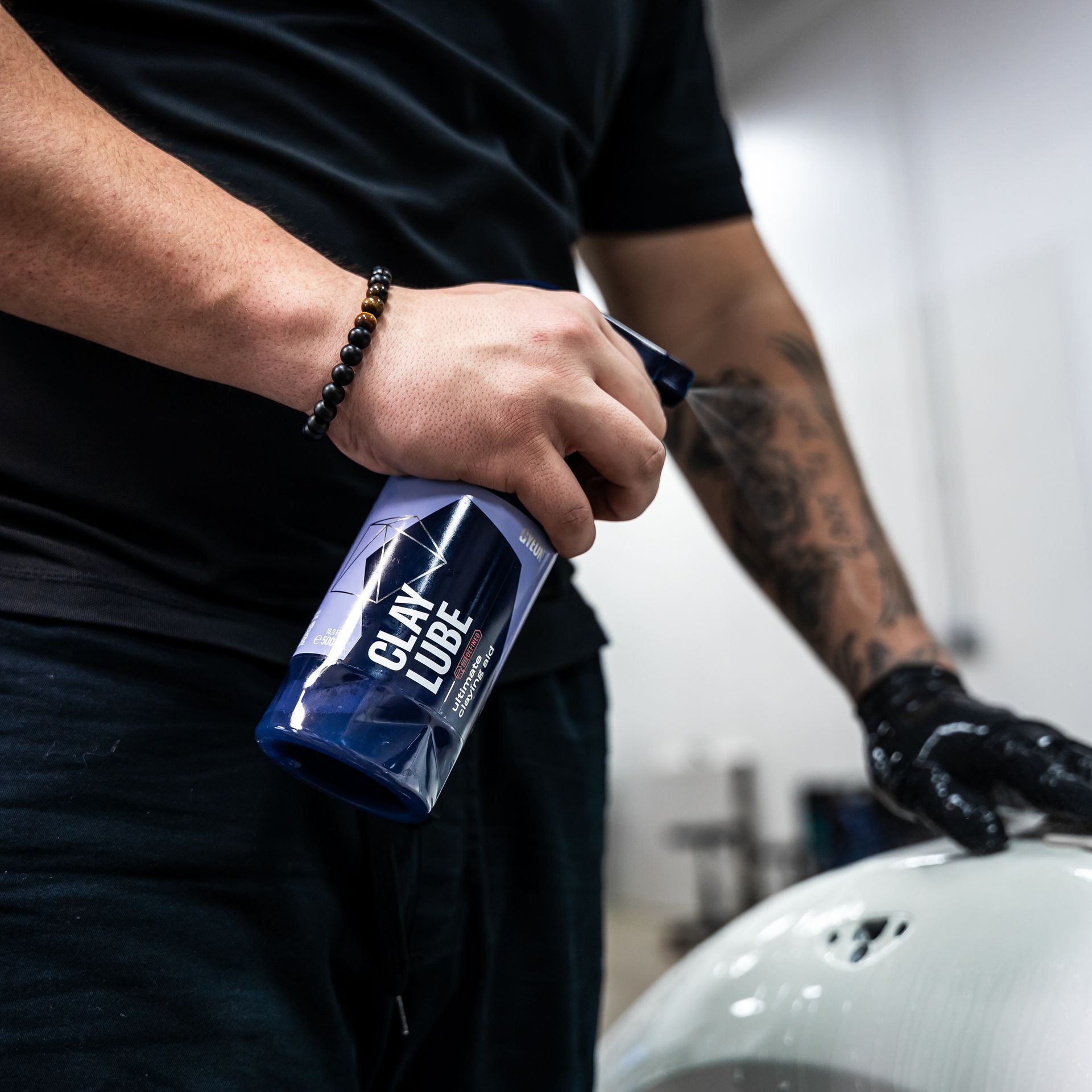 Gyeon Q2M Clay Lube and a clay bar to remove any remaining, embedded contaminants. To wrap up our decontamination wash, we’ll dry the whole car using a touchless