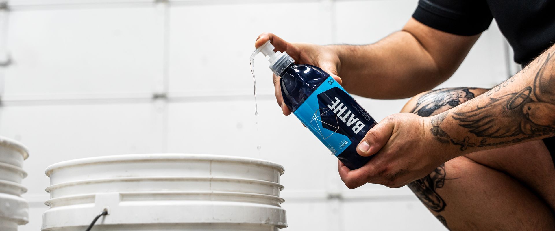 When washing your car, you should ALWAYS use the two-bucket method to avoid introducing scratches and swirls to your paint. Your first bucket will be filled with only water and you’ll use it to rinse your wash mitt between each panel. Your second bucket will have 10-15 pumps of GYEON Q2M Bathe in addition to the water and will be used to re-saturate your wash mitt with shampoo after rinsing it in the first bucket. If you have grit guards, be sure to place those in your buckets before starting.