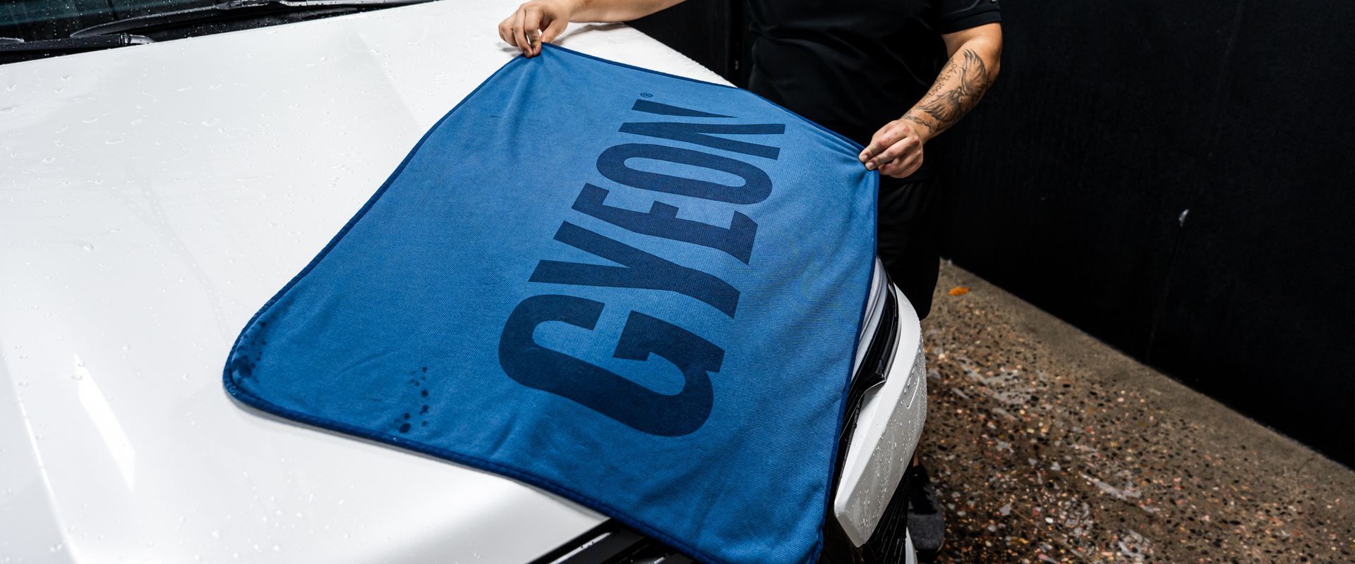 GYEON Q2M Bald Wipe. Spread the product over a panel before wiping it off with a dry microfiber. Repeat this process for each panel until the vehicle is completed.