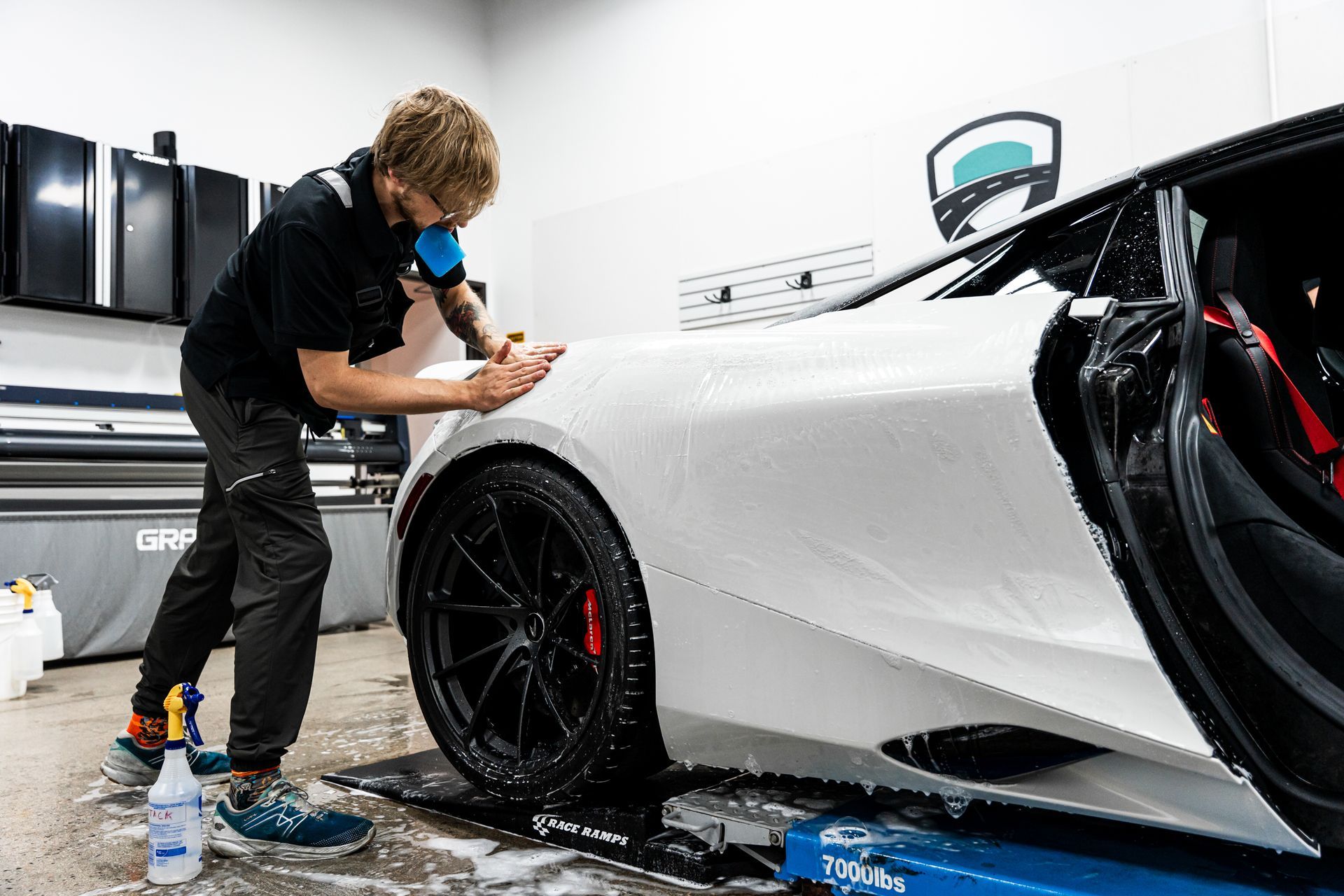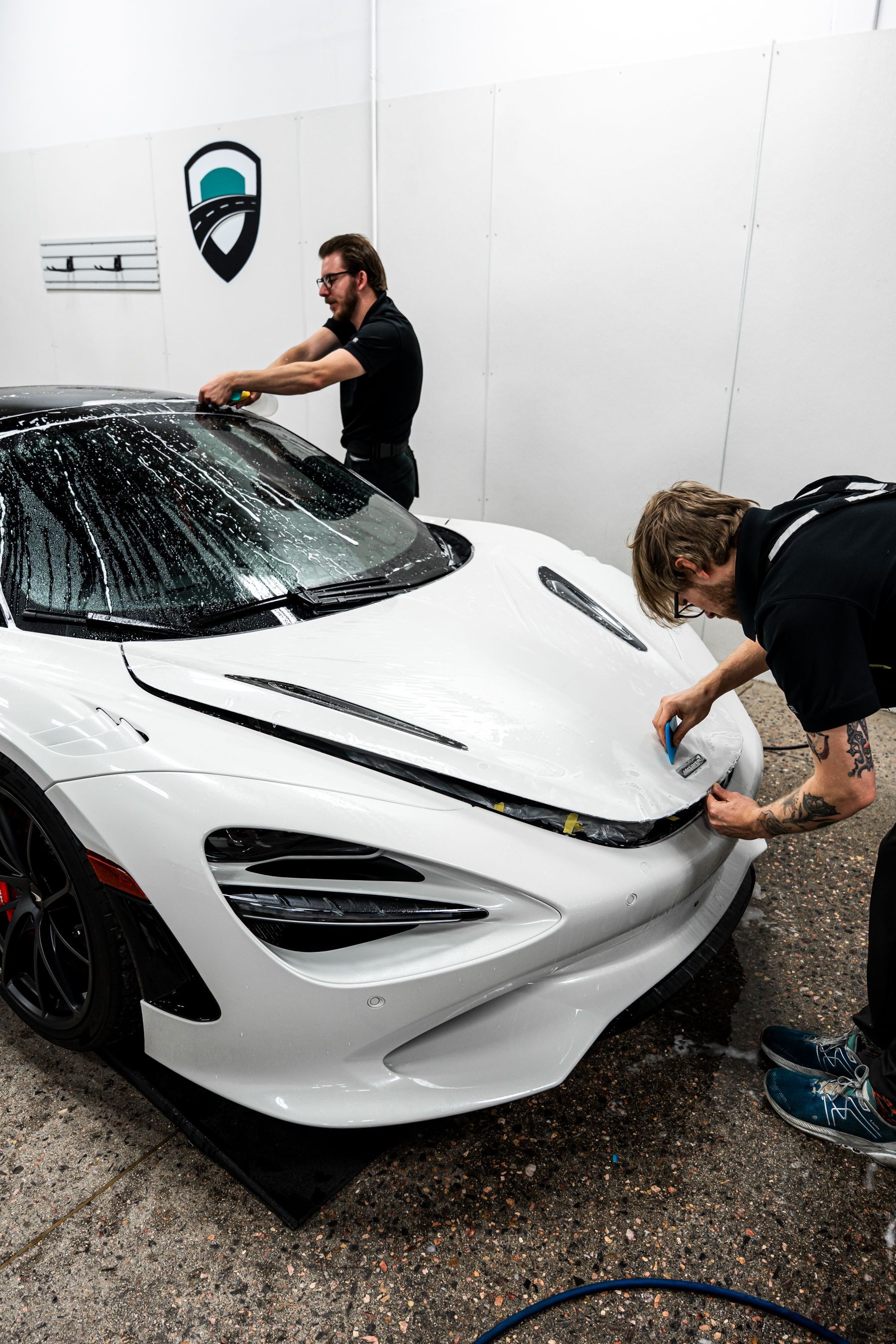 Using the same method, we’ll install paint protection film on every panel on this 750S. Once we’ve completed the vehicle, we’ll let it sit overnight to allow any moisture to evaporate and reveal any touch-ups or unwrapped edges. After trimming any undesirable defects, we’ll move the car to our light booth for its final service.