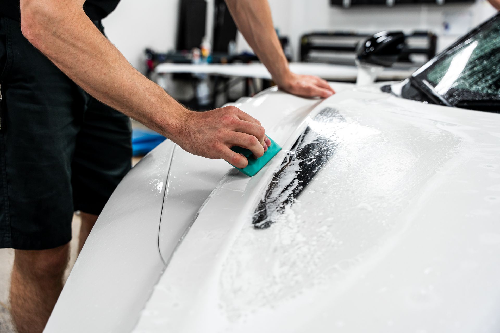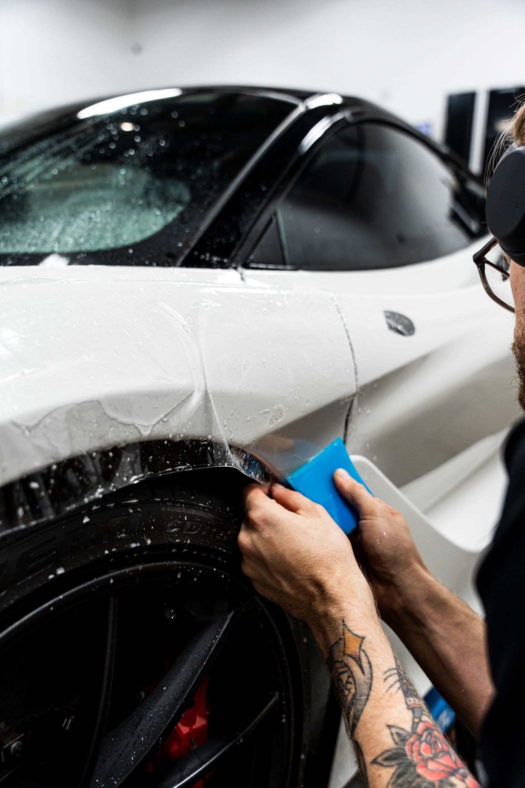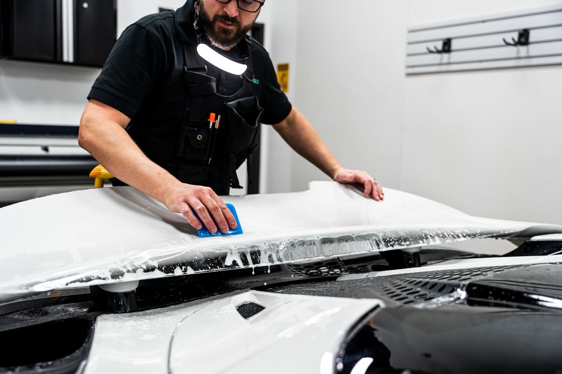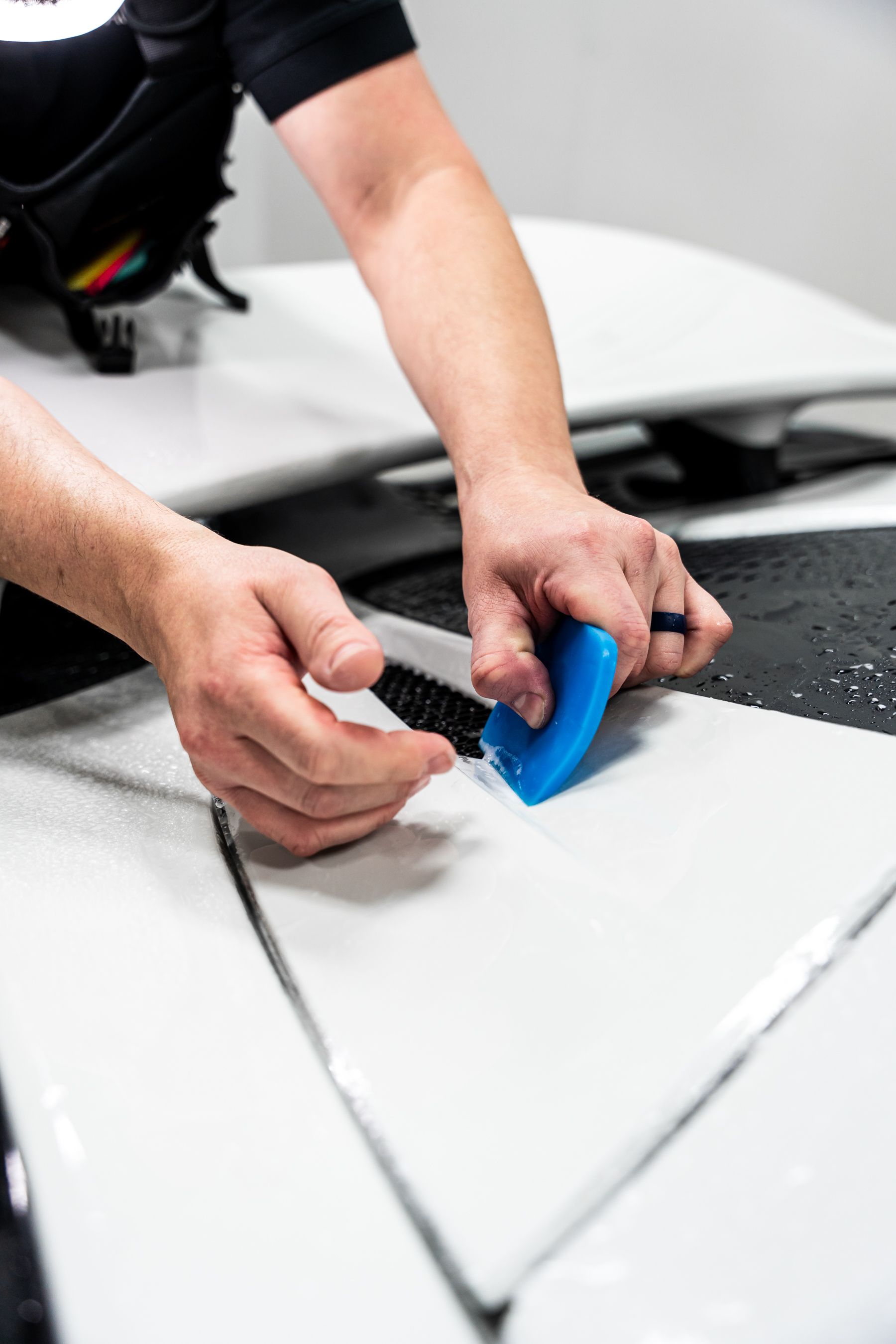 Once the panel is saturated in slip solution, our installers will lay the film onto the panel and set their anchor points so that the clear bra does not move around while they are installing. To adhere the PPF to the paint, we’ll use a squeegee to push the slip solution out from underneath the film, allowing the adhesive in the PPF to stick to the paint.