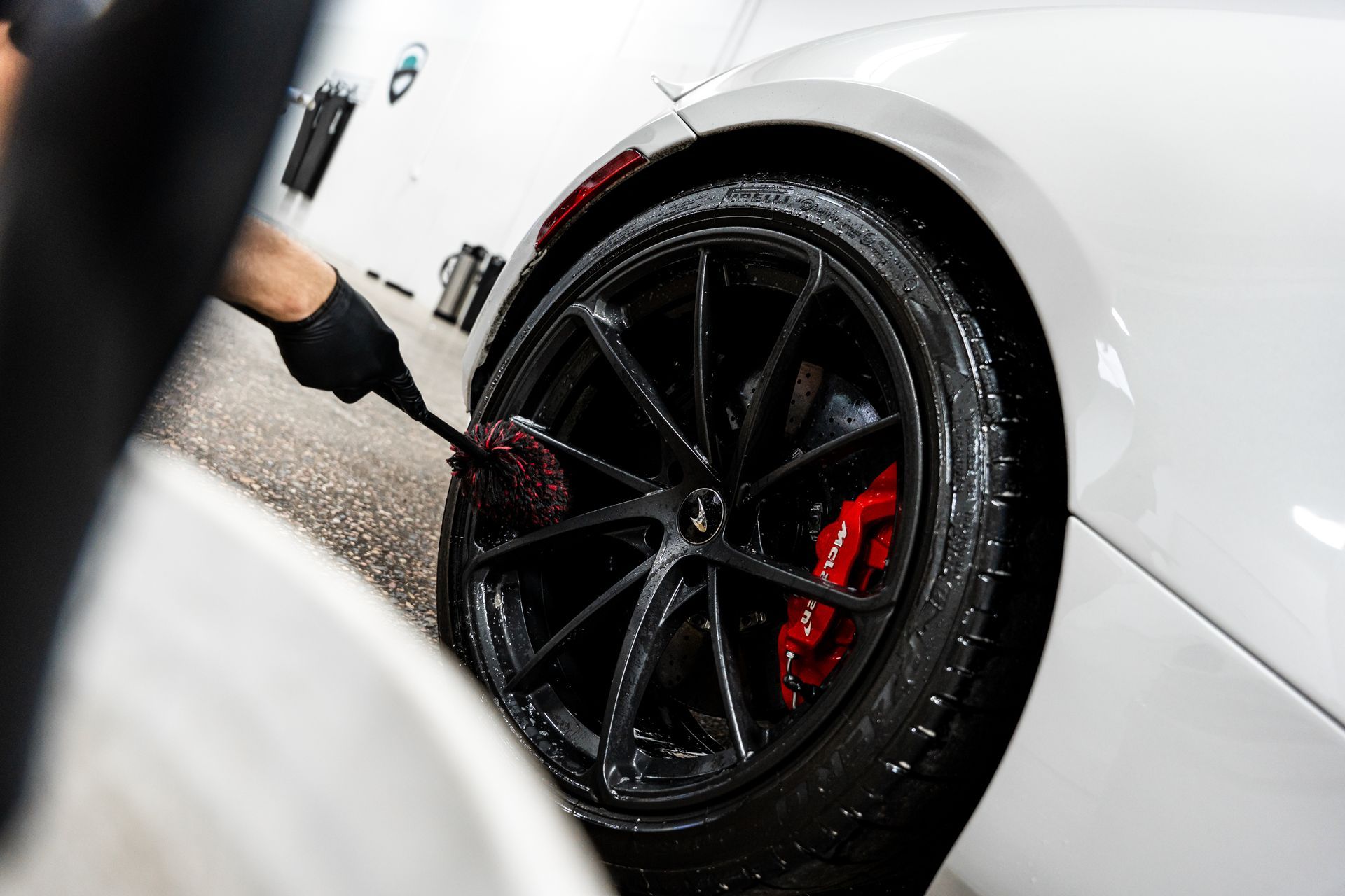 Before we do any work on the paint, we’ll focus on the wheels. Since this 750S came equipped with carbon ceramic brakes, we won’t use products using any iron decontamination as it risks damaging the brake surface. Instead, we will use a gentle, acid-free wheel cleaner. Once any dirt, grime and brake dust has been removed, we’ll rinse the wheels off and move onto our pre-wash step.